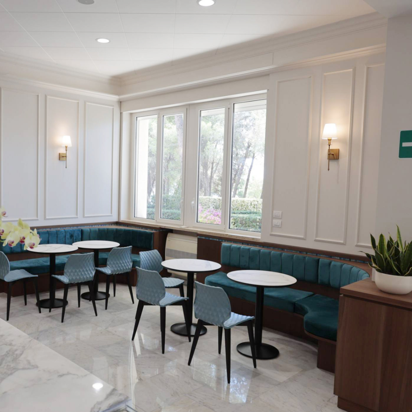 Il bar interno completa l’offerta con uno spazio informale di pausa e ristoro.